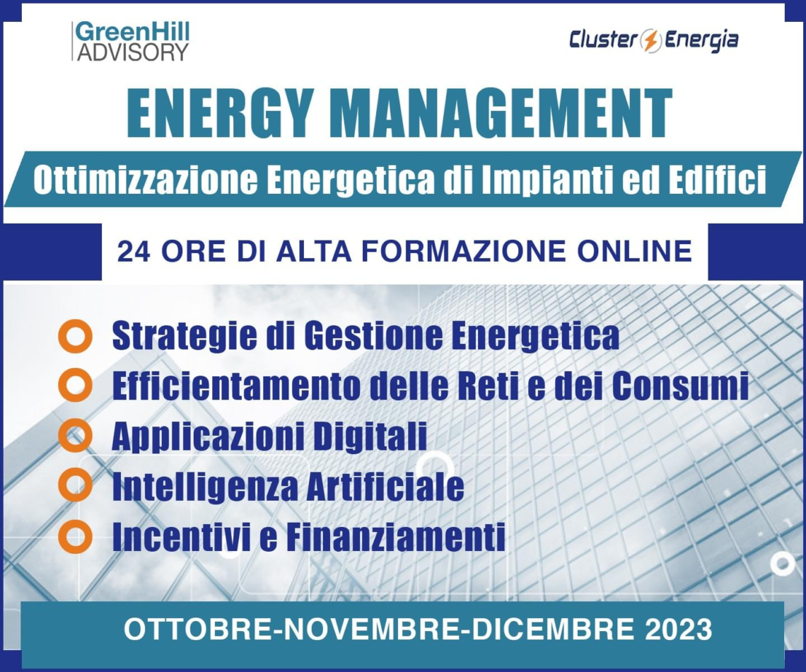 Il Cluster Tecnologico Nazionale Energia e GreenHillAdvisory promuovono nel quarto trimestre del 2023 il percorso formativo per aziende e professionisti “Energy Management”, finalizzato a fornire un quadro completo rispetto l’attuazione di strategie di gestione e ottimizzazione energetica di impianti ed edifici.