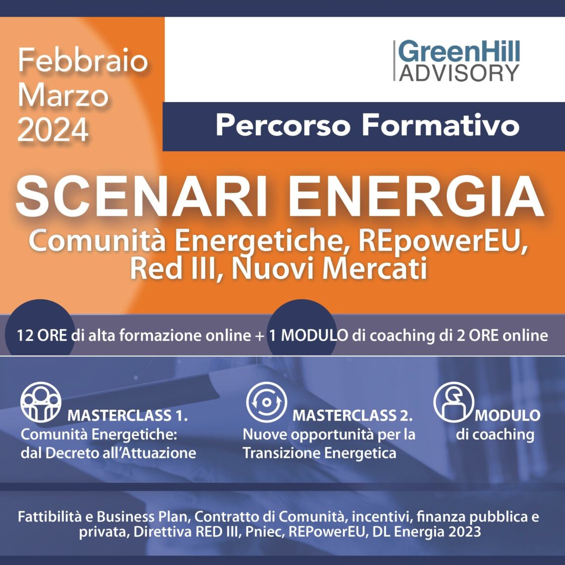 In questo contesto, GreenHillAdvisory promuove il Percorso Formativo Online “SCENARI ENERGIA” costituito da due Masterclass e un Modulo Integrativo di Coaching con l’obiettivo di sostenere aziende, professionisti e consulenti nell’acquisire le competenze necessarie per competere sul mercato.